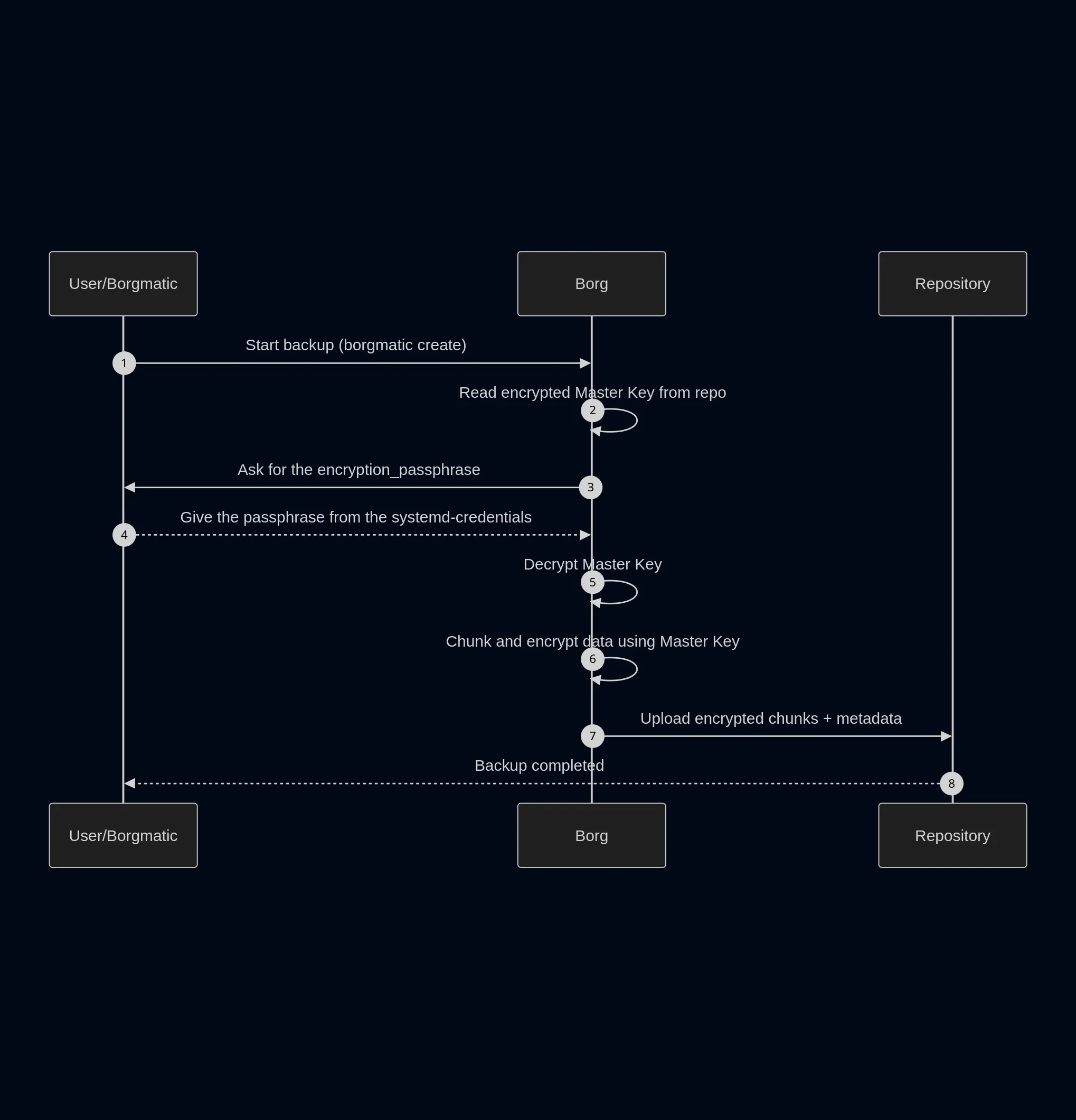 When the repository is created (borgmatic repo-create --encryption repokey-blake2) an decryption key is created, let’s call it “Master Key”.